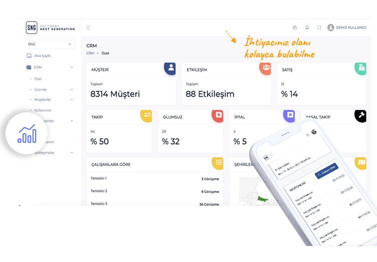 SNG Müşteri Yönetimi Programı (CRM), müşteri ilişkilerini daha etkin yönetmek isteyen işletmeler için geliştirilmiş kapsamlı bir yazılım çözümüdür. Bu yazılım, müşteri ve potansiyel müşteri kayıtlarını tutmaktan satış fırsatlarını izlemeye, kampanya, teklif ve sözleşme yönetiminden raporlama süreçlerine kadar tüm ihtiyaçlarınızı ister web ister mobil uygulama üzerinden kolayca yönetmenizi sağlar.